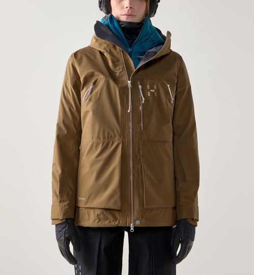 ヘルメット対応のフード、バックパック対応の斜めのベンチレーションジッパー、雪の侵入を防ぐラバーグリップ付きの伸縮性スノースカートなど、バックカントリーの必需品をすべて備えた、Haglöfsで最も機能的なスノージャケット。