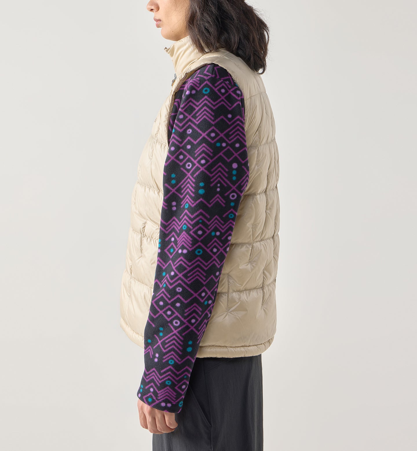 デイリーユースに最適なベストは、700フィルパワーのRDS認証ダウンを採用し、HaglöfsのHロゴを模したバッフルデザインがユニークさを際立たせる。